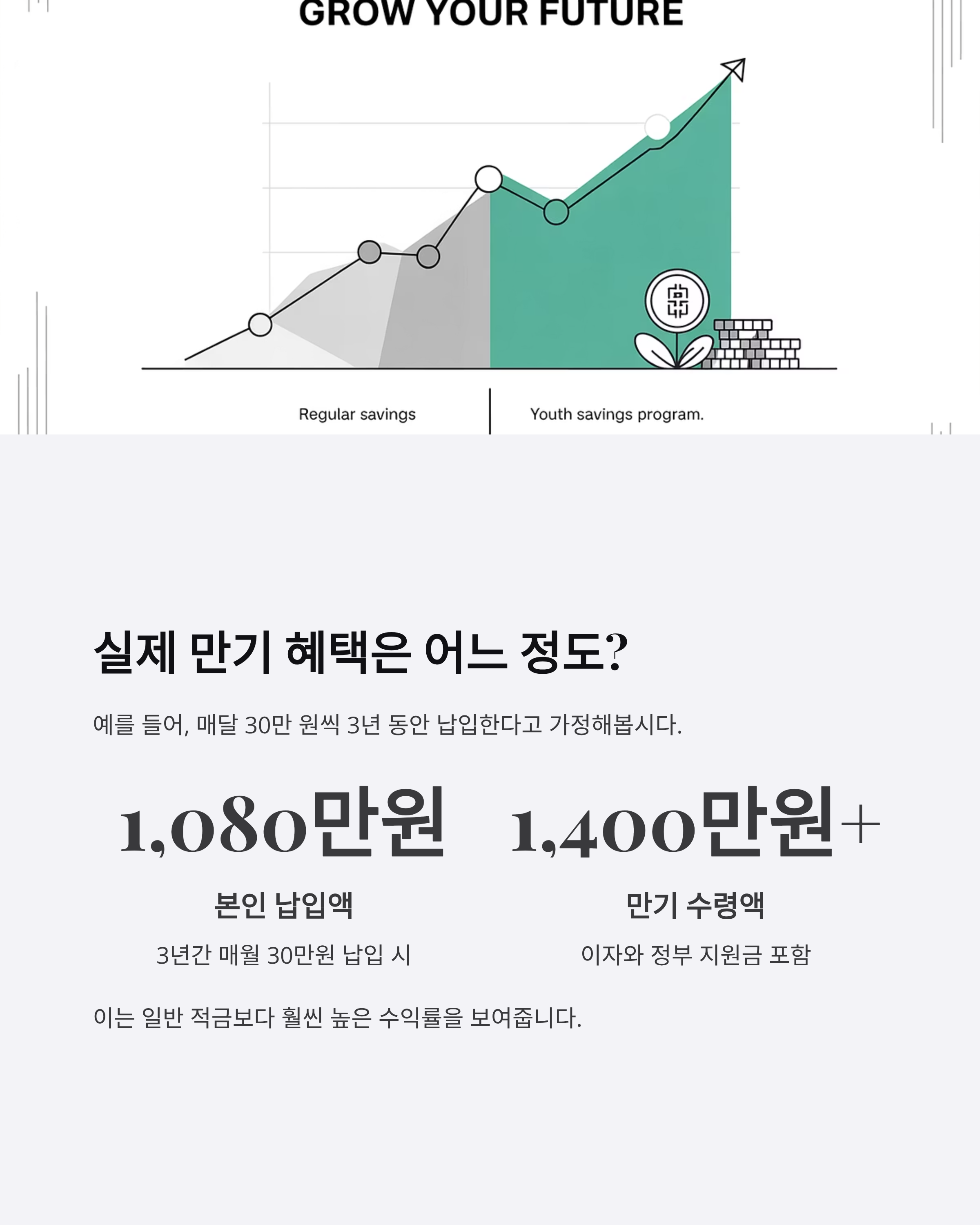 예를 들어, 매달 30만 원씩 3년 동안 납입한다고 가정해봅시다. 본인 납입액은 1,080만 원이지만, 이자와 정부 지원금을 더하면 약 1,400만 원 이상 수령이 가능합니다. 이는 일반 적금보다 훨씬 높은 수익률을 보여줍니다.