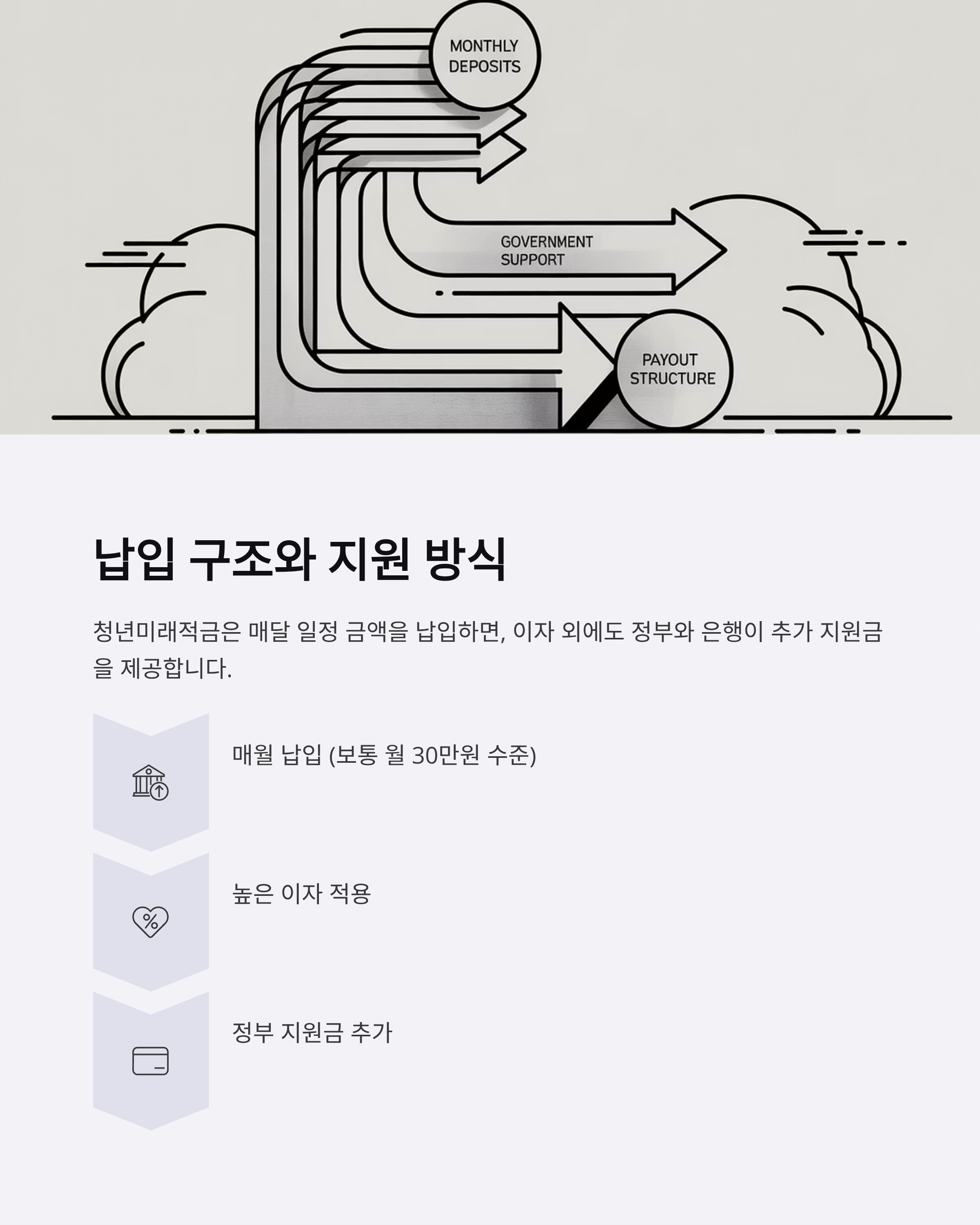 청년미래적금은 매달 일정 금액을 납입하면, 이자 외에도 정부와 은행이 추가 지원금을 제공합니다. 납입 가능 금액은 은행마다 조금씩 다르지만 보통 월 30만 원 수준에서 시작합니다. 만기 시에는 본인 납입액 + 이자 + 정부 지원금을 합산해 수령하게 됩니다.