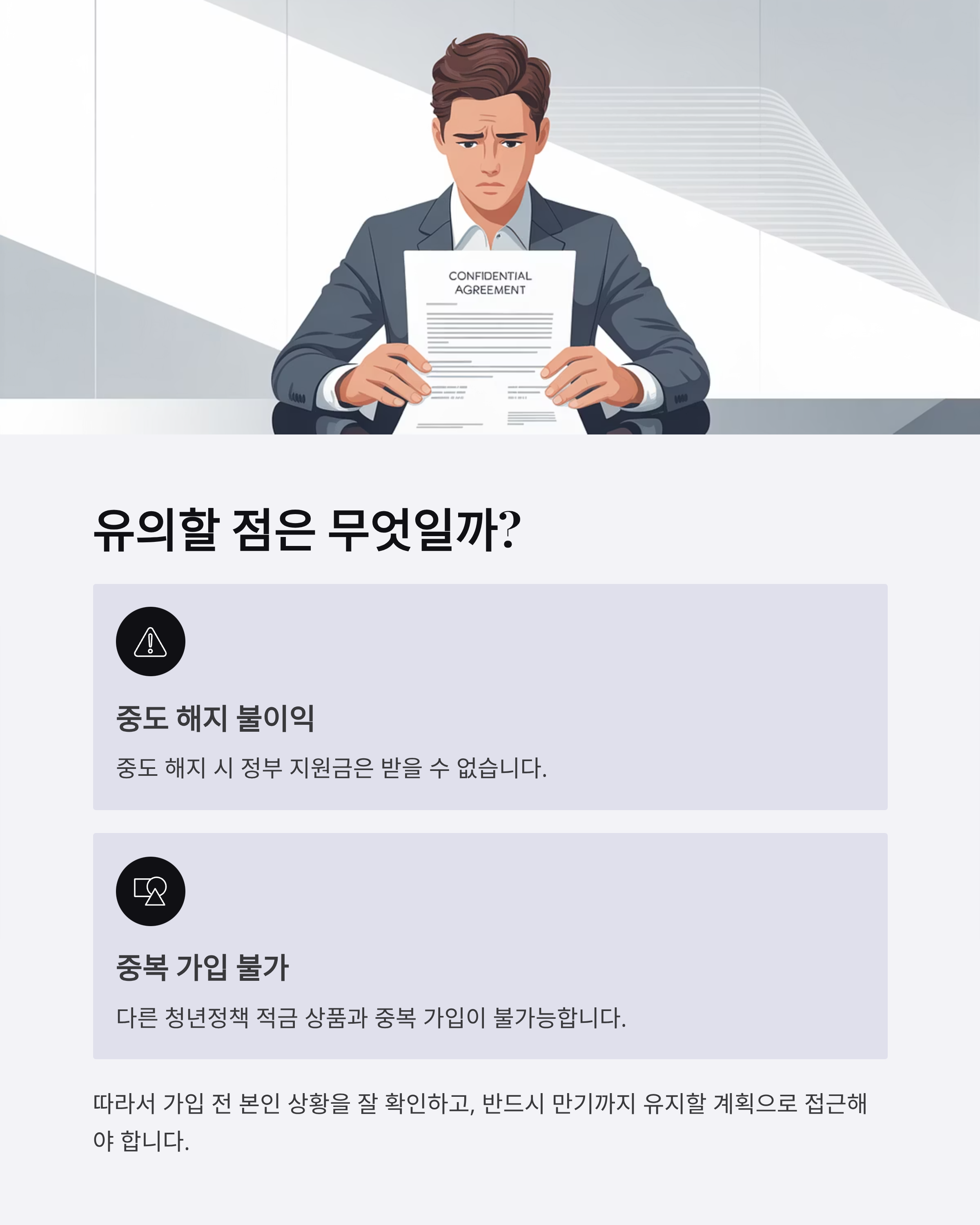 중도 해지 시 정부 지원금은 받을 수 없습니다. 또, 다른 청년정책 적금 상품과 중복 가입이 불가능합니다. 따라서 가입 전 본인 상황을 잘 확인하고, 반드시 만기까지 유지할 계획으로 접근해야 합니다.