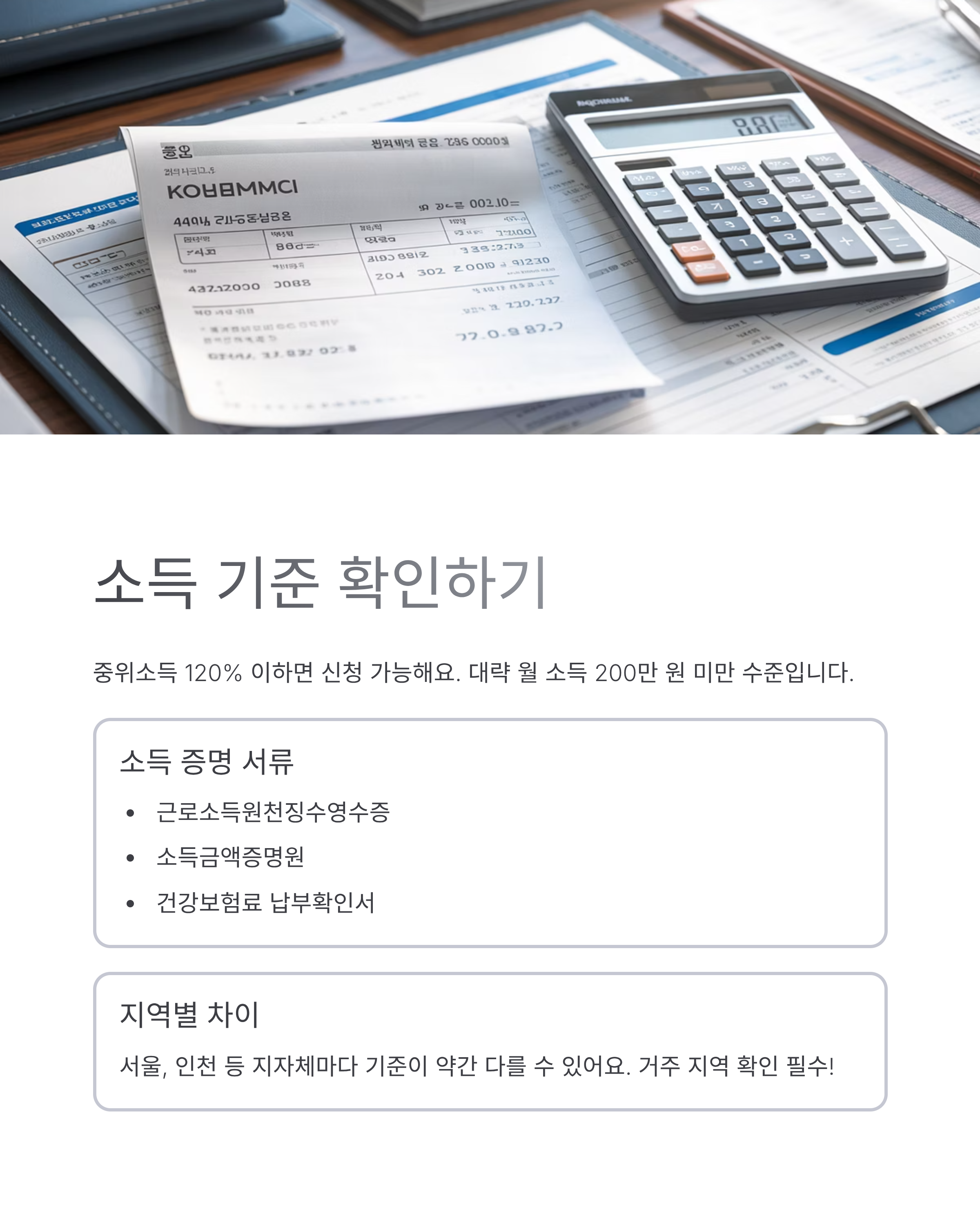3. **소득**: 중위소득 120% 이하 (월 소득 200만 원 미만 정도).