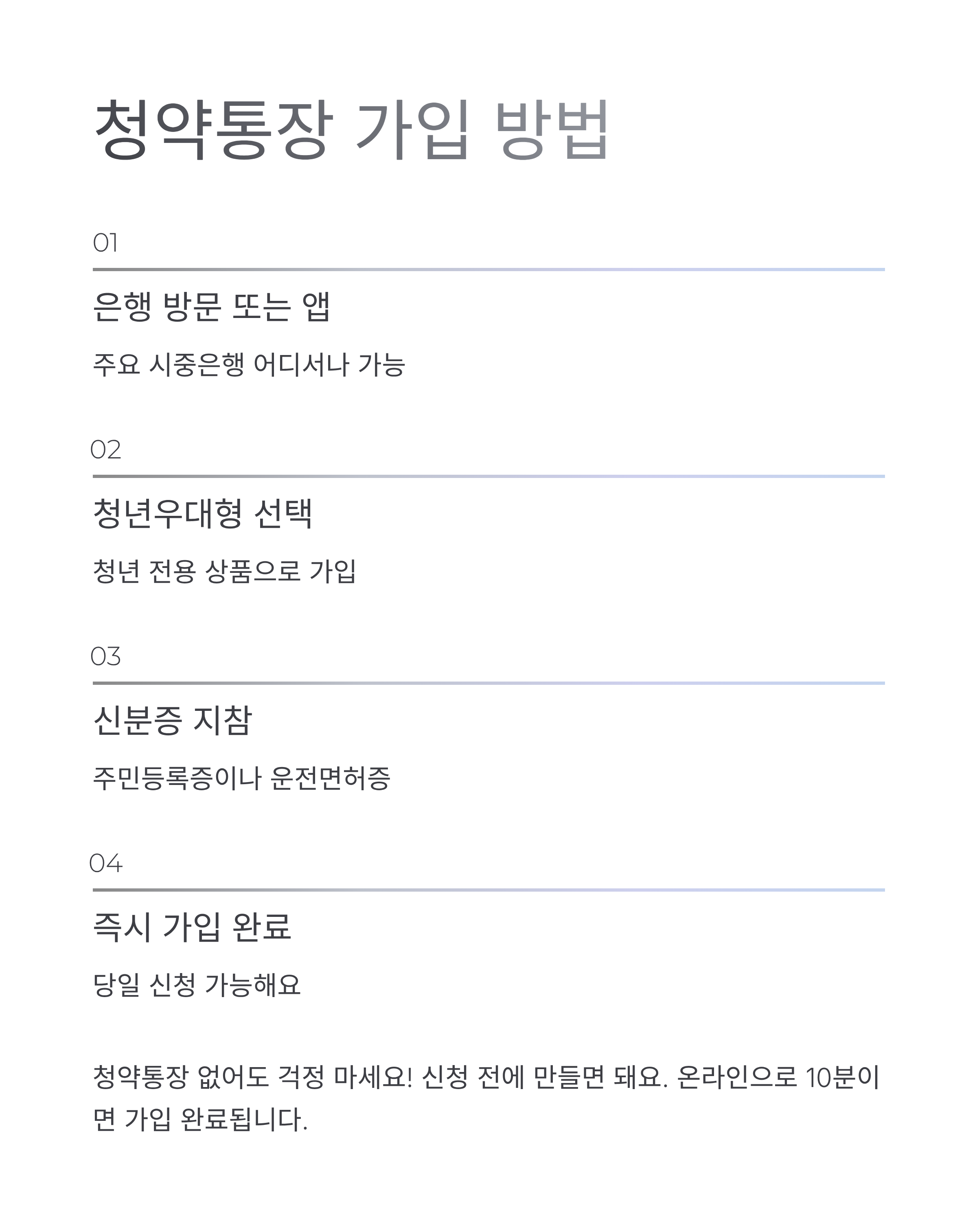 2. **청약통장**: 청약통장에 가입 필수 – 없으면 바로 만들고 신청!