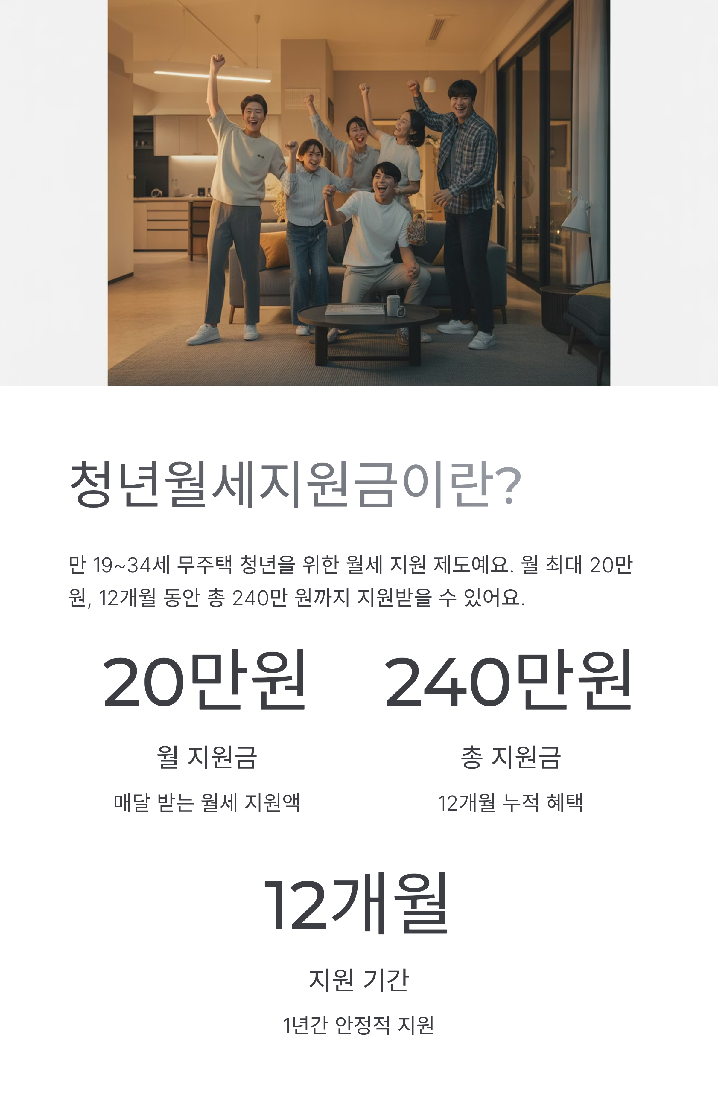 청년월세지원금 3가지조건은 연령(19~34세 무주택), 청약통장, 소득(중위 120% 이하) – 2025년 2월까지 신청으로 월 20만 원 지원받아, 총 240만 원 혜택!