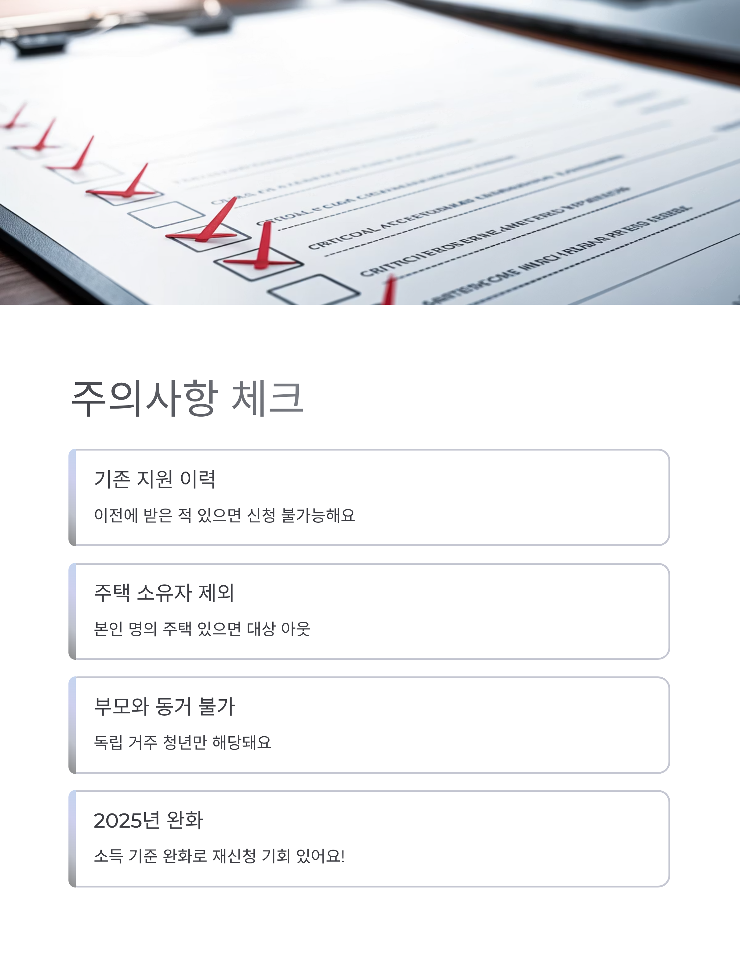 기존 지원 이력 있으면 안 돼, 그리고 주택 소유자나 부모와 동거는 대상 아웃. 2025년부터 소득 기준이 조금 완화됐으니, 재신청 가능할 수 있어. 나처럼 지방에서 서울 이사 왔을 때 조건 확인 안 해서 포기한 적 있는데, 이번에 다시 도전해볼까 해 – 너도 미리 체크해!