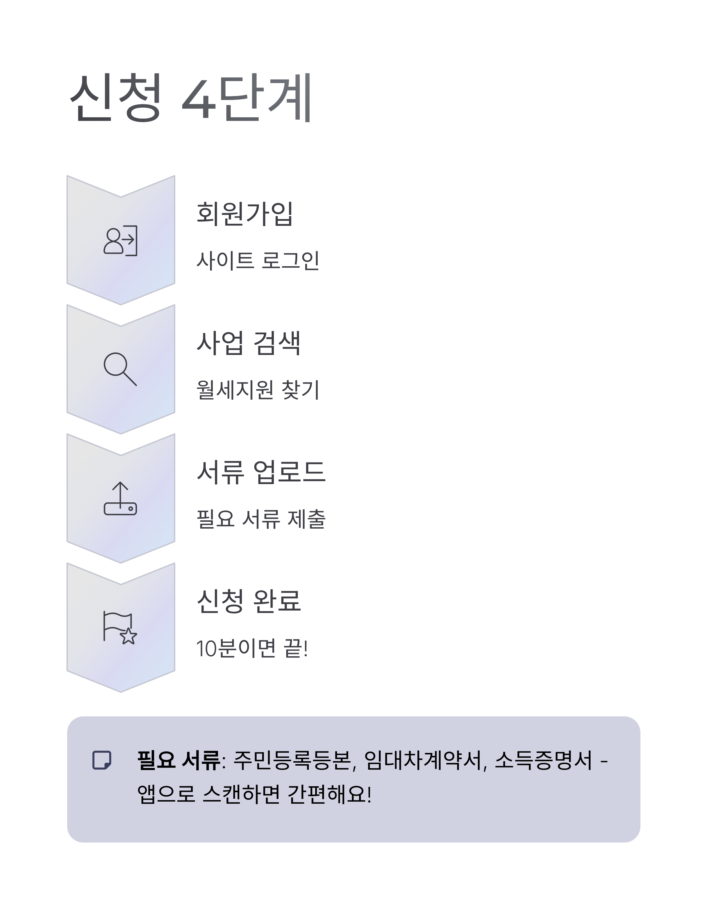 신청은 복지로 사이트(bokjiro.go.kr)나 서울주거포털(housing.seoul.go.kr)에서 온라인으로! 스텝: 1. 회원가입·로그인, 2. 지원 사업 검색, 3. 서류 업로드(주민등록등본, 임대차계약서, 소득증명), 4. 제출. 나 처음 할 때 서류 때문에 헤맸는데, 앱으로 스캔하면 10분 컷! 지자체별로 다르니 지역 확인 필수야.