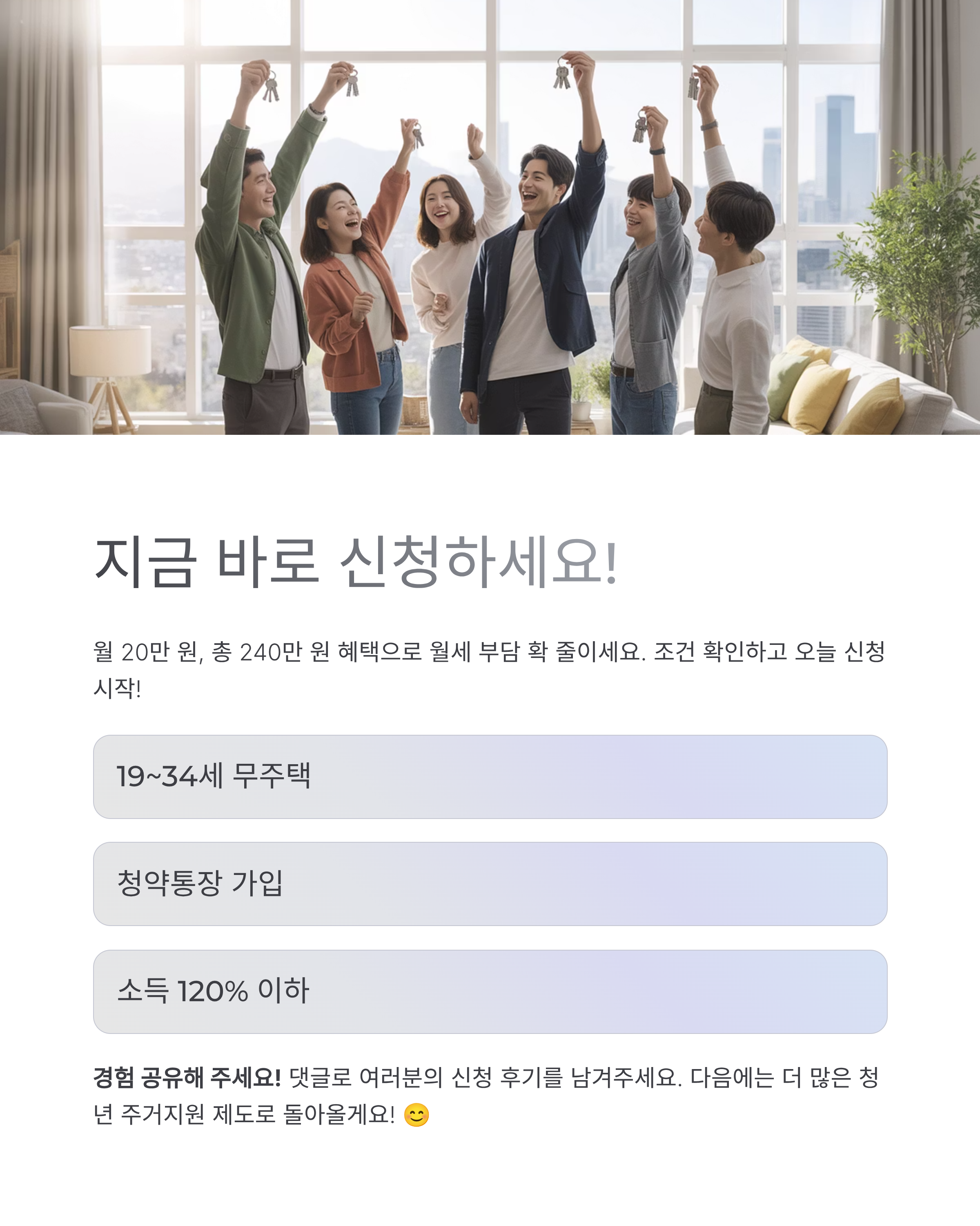 월세 걱정으로 힘든 너, 이 혜택 받았어? 경험 공유 댓글로 남겨줘 – 나도 응원해! 다음 글에서는 청년 주거지원 다른 제도로 돌아올게, 기대해~ 😊
