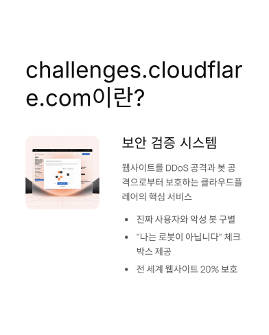 클라우드플레어는 웹사이트를 DDoS 공격이나 봇 공격으로부터 보호하기 위해 사용자가 진짜 사람인지 확인하는 절차를 거치게 해요. "나는 로봇이 아닙니다" 체크박스나 이미지 선택 같은 것들이 바로 challenges.cloudflare.com에서 제공하는 보안 검증이랍니다.