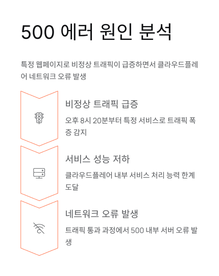 클라우드플레어 관계자는 "협정세계시 기준 11시 20분(한국 시간 오후 8시 20분)부터 한 서비스로 유입되는 비정상 트래픽이 급증하는 것을 확인했다"고 밝혔어요. 특정 웹페이지로 트래픽이 갑자기 몰리면서 클라우드플레어 네트워크를 통과하는 일부 트래픽에 오류가 발생한 거죠.