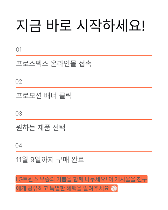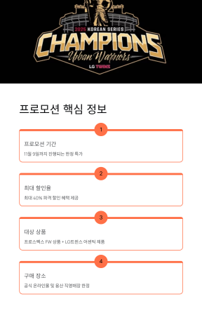 프로모션 취지는 LG트윈스의 통합 우승을 함께 축하하고 그 기쁨을 팬들과 소비자 모두가 나누자는 거예요. 이렇게 큰 할인 행사는 자주 없으니까 관심 있는 제품이 있다면 서둘러야 해요.