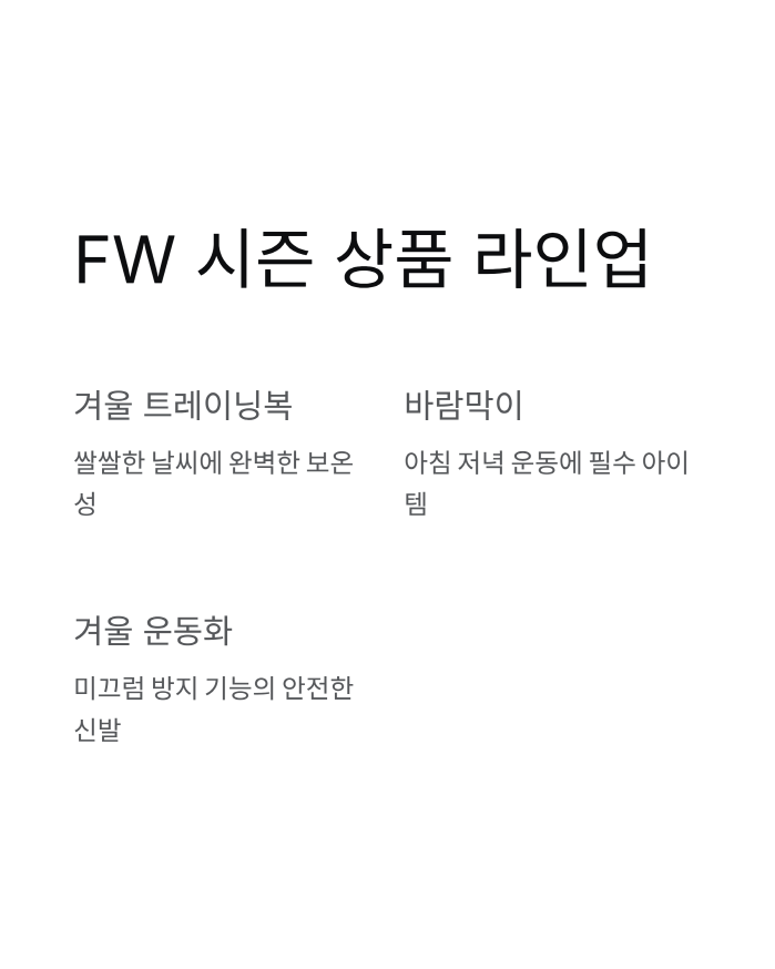 두 번째는 FW 시즌 의류예요. 겨울 운동복, 트레이닝복, 바람막이 같은 아이템들이 할인되니까 겨울 준비하기 딱 좋아요. 특히 아침 저녁으로 쌀쌀할 때 운동하시는 분들한테 필요한 아이템들이에요.