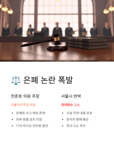 서울시는 11월 18일 입장문을 내고 "천 의원이 전혀 사실과 무관한 내용을 유포해 즉각 고소에 착수했다"고 밝혔어요. 서울시는 "단순한 정치공세를 넘어 공직자 명예와 시민 신뢰를 심각하게 훼손하는 행위"라며 강하게 비판했답니다!