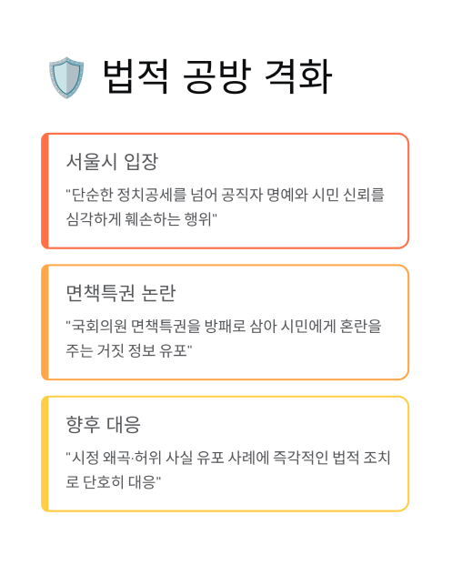 서울시는 "국회의원 면책특권을 방패로 삼아 시민에게 혼란을 주는 거짓 정보를 퍼뜨리는 일이 더는 반복돼선 안 된다"고 강조했어요. 앞으로도 시정을 왜곡하거나 허위 사실을 유포하는 사례에 대해 "즉각적인 법적 조치를 포함해 단호히 대응하겠다"고 밝혔답니다!