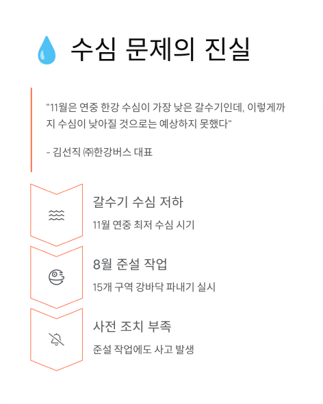 김선직 대표는 "11월은 연중 한강 수심이 가장 낮은 갈수기인데, 이렇게까지 수심이 낮아질 것으로는 예상하지 못했다"고 해명했어요. 서울시는 정식 운항 전에 15개 구역에서 강바닥을 파내는 준설 작업을 했다고 하지만, 그럼에도 사고를 막지 못한 거죠!