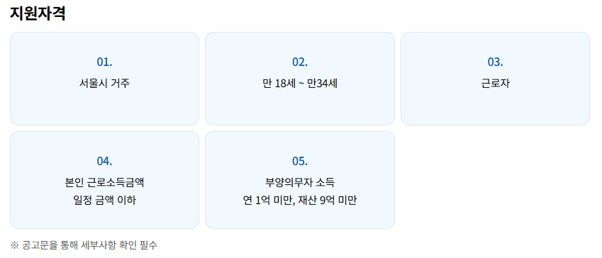 - 공고일 현재 만 18세 이상 만 34세 이하의 서울시 거주 청년 (병역 이행 기간은 최대 6년까지 인정하여 연령 상한을 만 39세까지 연장 가능)