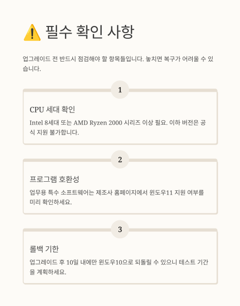 업그레이드 전 반드시 확인해야 할 필수 사항들을 놓치면 시스템 오류나 데이터 손실이 발생할 수 있습니다. 특히 구형 하드웨어나 특수 소프트웨어 사용자는 호환성 문제로 업그레이드 후 되돌리기 어려운 상황이 생길 수 있어 사전 점검이 매우 중요합니다.