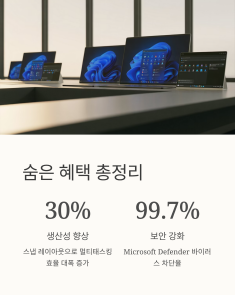 윈도우11은 Microsoft Teams 통합으로 화상회의가 간편해지고, 스냅 레이아웃으로 멀티태스킹 효율이 30% 향상됩니다.