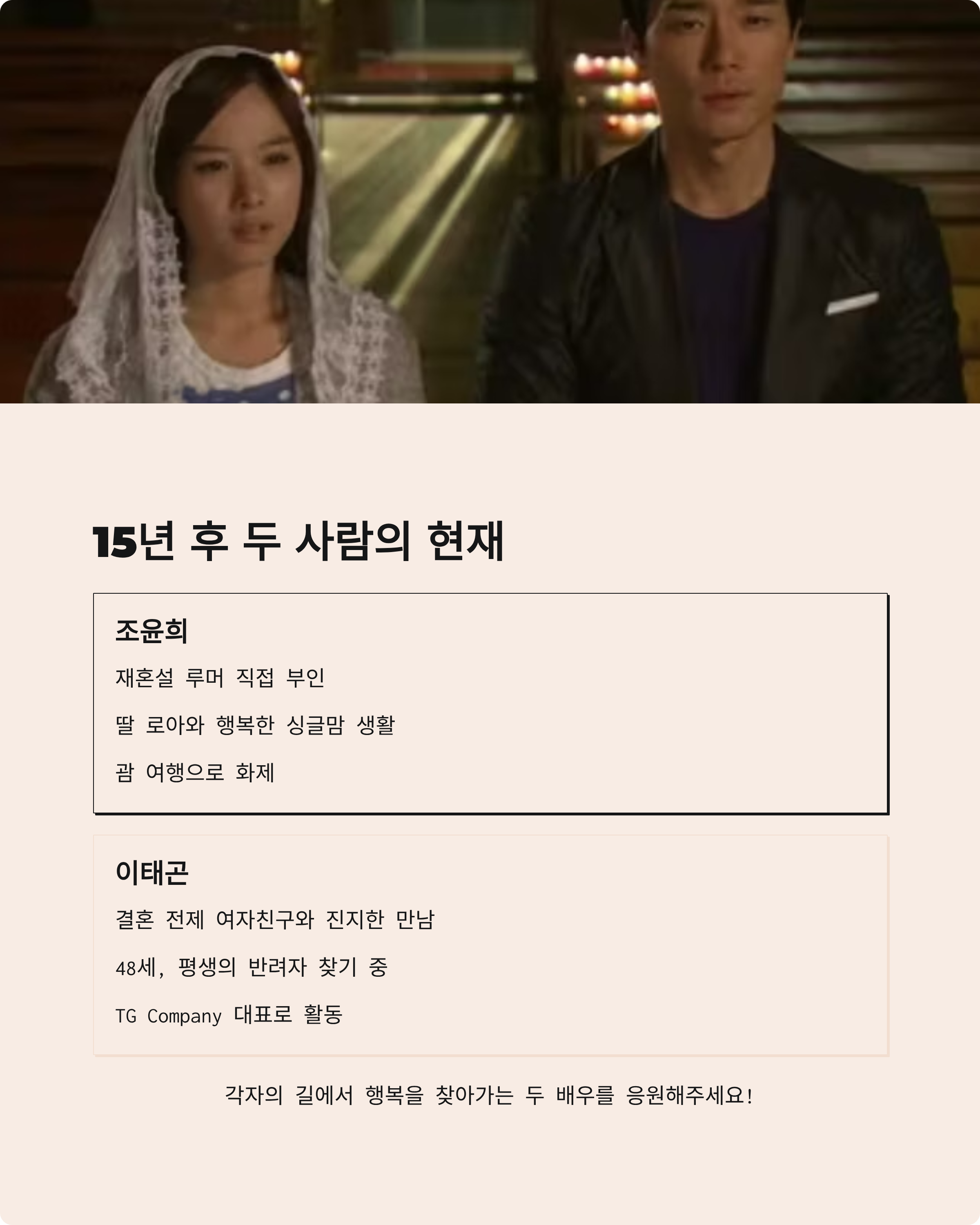 2010년 황금물고기에서 환상의 케미를 보여줬던 조윤희와 이태곤! 지금은 서로 다른 인생을 살아가고 있지만, 각자의 자리에서 열심히 살아가는 모습이 정말 멋져요. 조윤희는 훌륭한 엄마로, 이태곤은 새로운 사랑을 찾아가는 모습으로 말이죠!