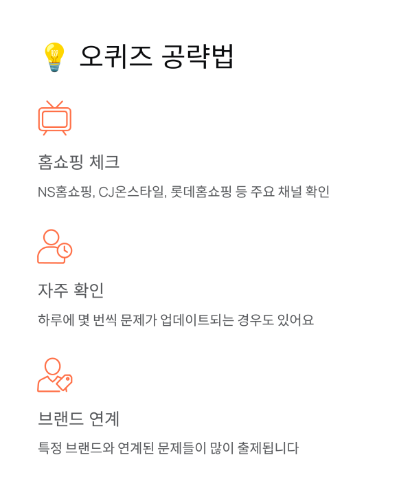 보통 홈쇼핑 방송이나 특정 브랜드와 연계된 문제들이 많이 나오더라고요. NS홈쇼핑, CJ온스타일, 롯데홈쇼핑 등 주요 채널들 체크해 두시면 도움 될 거예요.