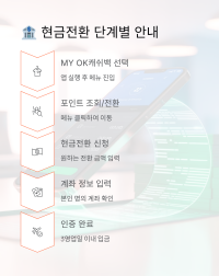 현금전환은 앱에서 'MY OK캐쉬백' → '포인트 조회/전환' → '현금전환'을 선택하면 돼요. 본인 명의 계좌 정보 입력하고 인증하면 끝!