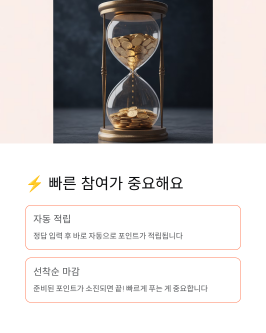 주의할 점은 준비된 포인트가 소진되면 끝이라는 거예요. 그래서 오퀴즈는 빠르게 푸는 게 정말 중요하답니다!