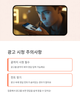 중요한 건 광고를 끝까지 봐야 정답을 입력할 수 있다는 거예요. 광고 속에 힌트가 숨어있는 경우가 많으니까 집중해서 보세요!