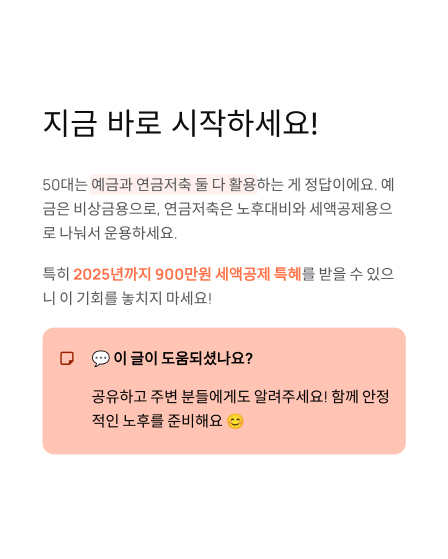 - ✅ 예금(비상금) + 연금저축(노후) 병행 전략 추천