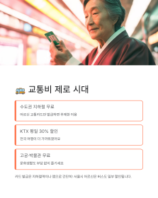 저희 엄마는 이 혜택으로 친구들 만나러 다니시는데, "젊었을 때 못 한 여행 다 한다"고 하세요. 65세 이상 정부지원 혜택 안내 필수 아이템이에요. 카드 발급은 지하철역이나 앱으로 간단히!