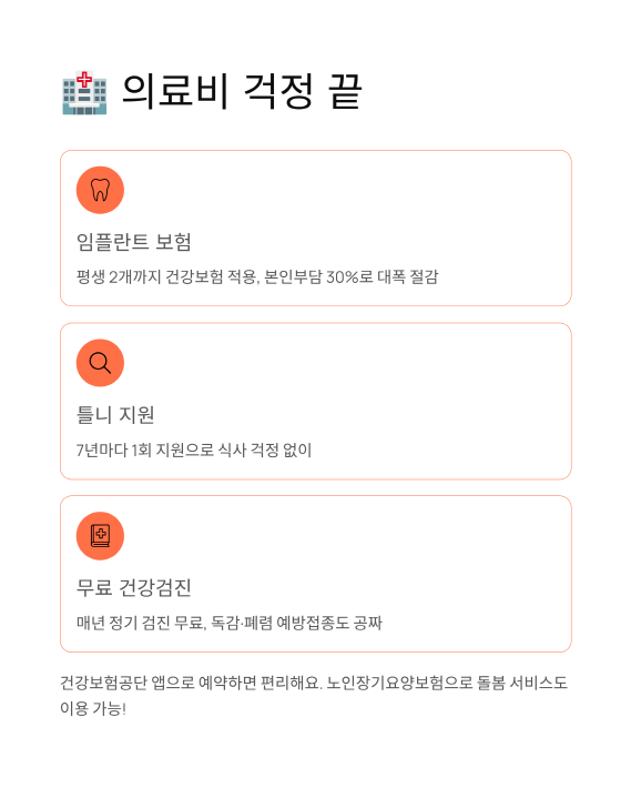 임플란트는 평생 2개까지 건강보험 적용, 본인부담 30%로 줄었고 틀니도 7년마다 1회 지원이에요. 무료 건강검진은 매년 받을 수 있고, 독감·폐렴 예방접종도 공짜! 노인장기요양보험으로 돌봄 서비스도 이용 가능해요.
