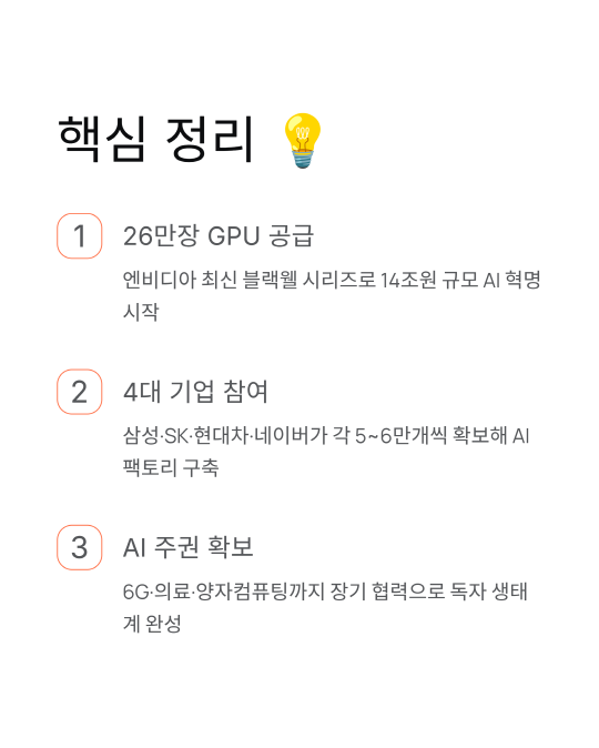 엔비디아가 한국을 AI 인프라 구축의 핵심 거점으로 낙점한 이유는 명확해요. 반도체, 제조, 통신, 게임까지 탄탄한 밸류체인을 갖추고 있고, AI 기술을 실제 산업으로 바로 적용할 수 있는 시장이기 때문이죠. 쉽게 말해 GPU를 받아서 실제로 제대로 활용할 수 있는 나라란 거예요.