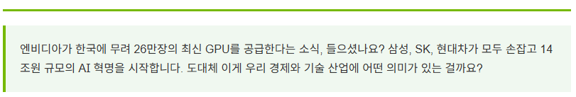 젠슨 황 엔비디아 CEO가 한국을 선택한 건 우연이 아니에요. 전 세계적으로 GPU 부족 현상이 심각한데, 한국이 26만장이라는 엄청난 물량을 우선 공급받게 됐거든요.