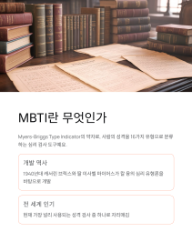 1940년대 캐서린 브릭스와 그녀의 딸 이사벨 마이어스가 개발했어요. 스위스 심리학자 칼 융의 심리 유형론을 바탕으로 만들어졌죠. 지금은 전 세계에서 가장 널리 사용되는 성격 검사 중 하나예요!
